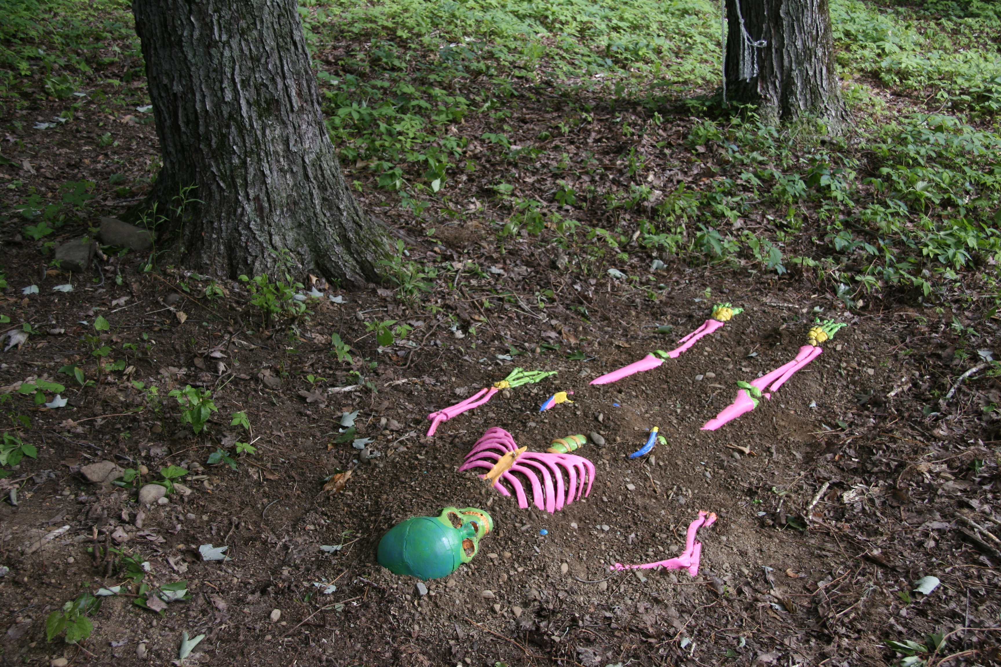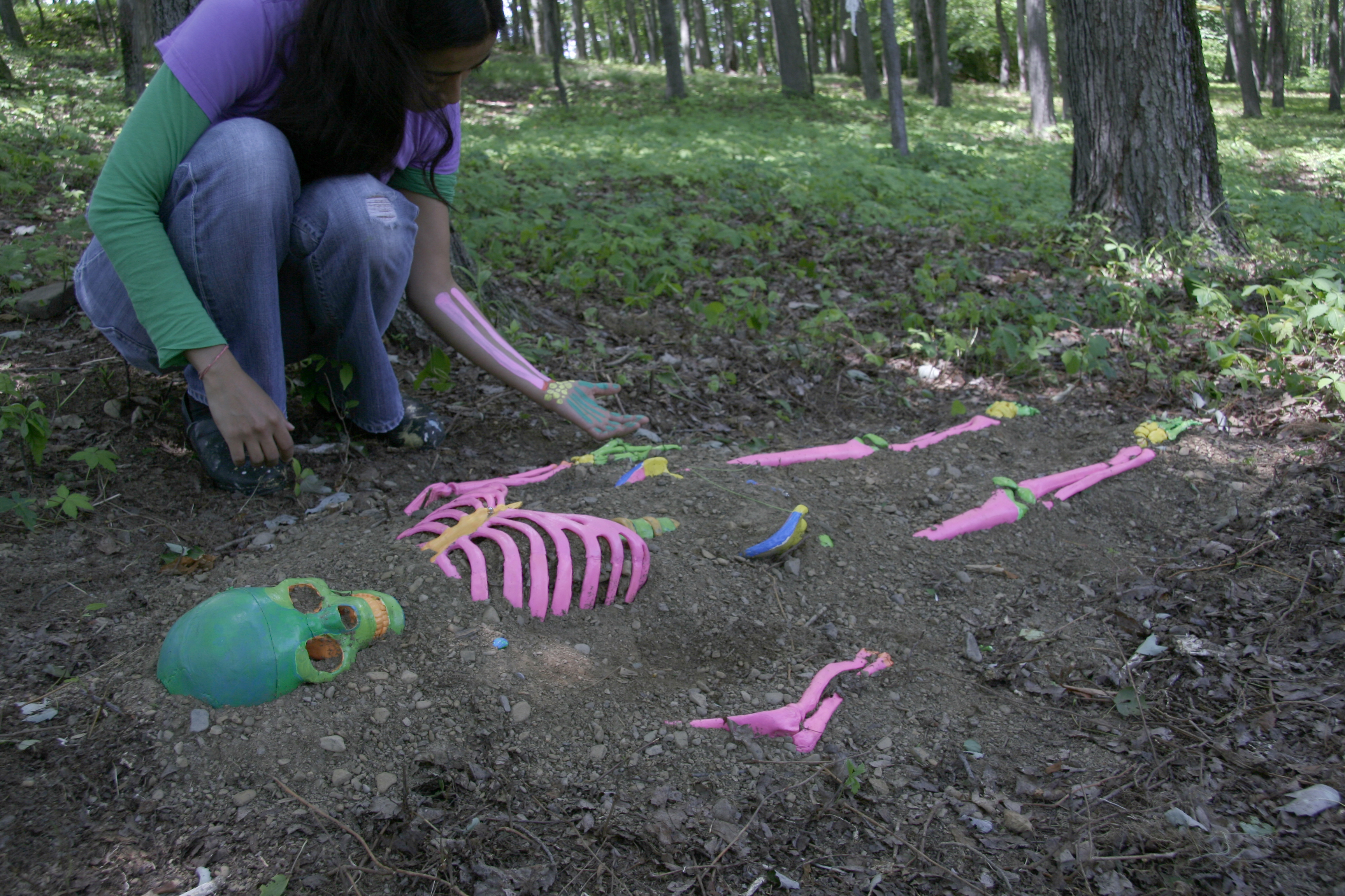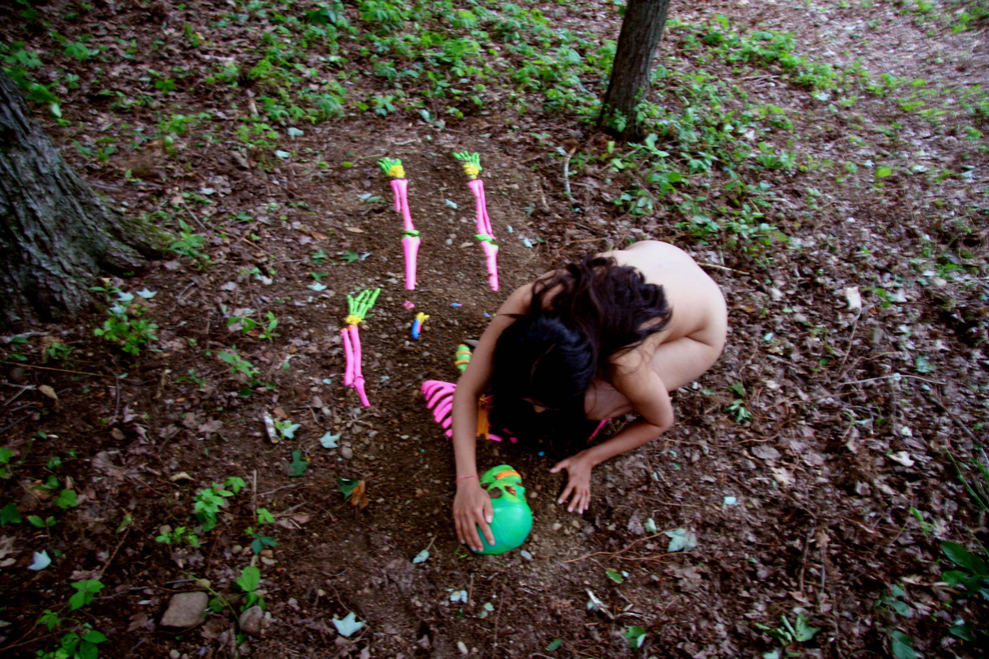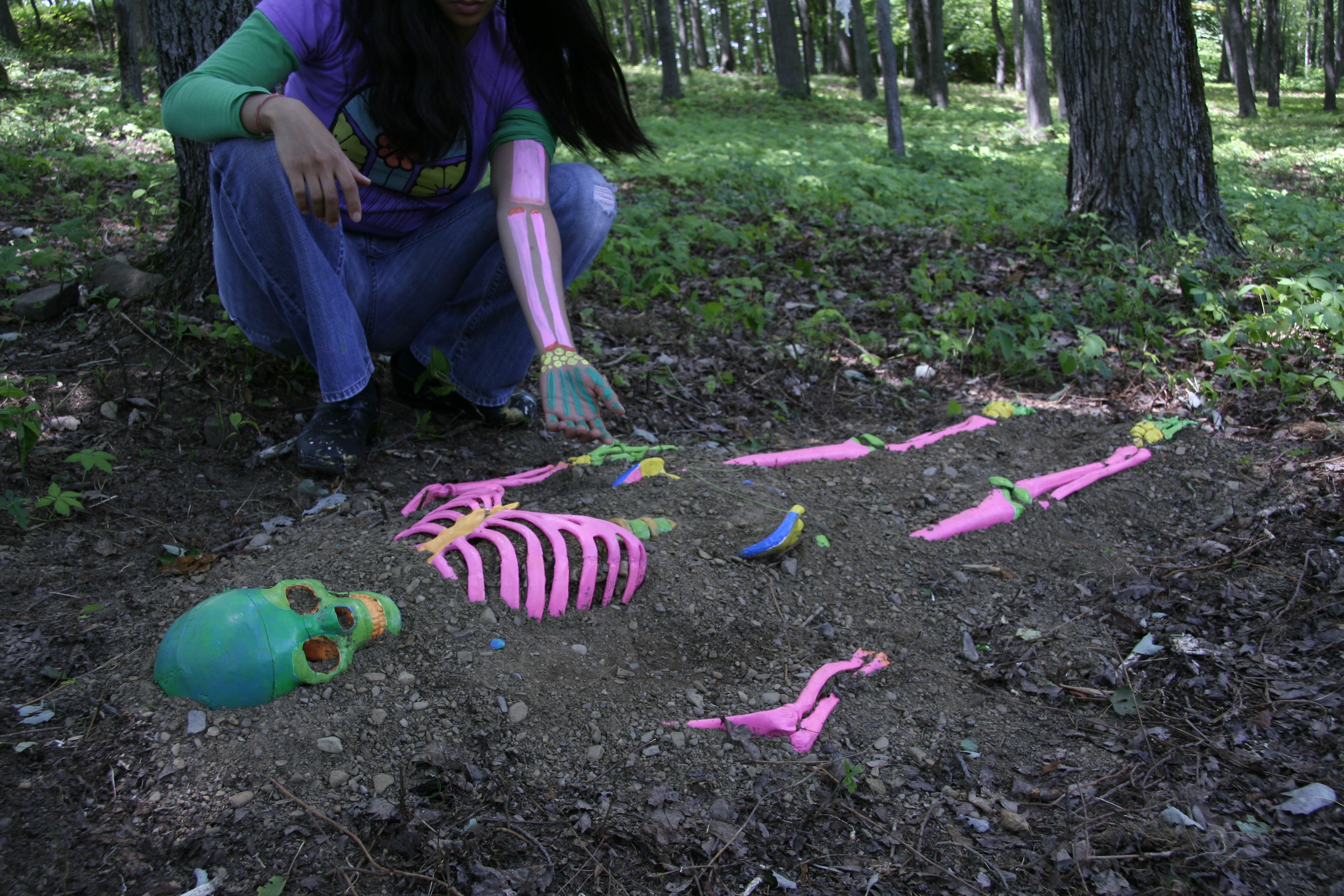In the woods documents the discovery of the body of an inhabitant of the future utopian fantasy world No Place, created by Saya Woolfalk. As the artist founder of the group of Empathics, she and the rest of her group set up a greenhouse to excavate the site. They come to believe that the bones were sent to them by these future inhabitants.