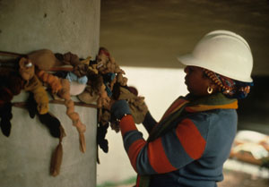 | Medium: 35mm slide | Comments: Collaboration between Senga Nengudi, David Hammons, and Maren Hassinger. Supported by a CETA Art in Public Spaces grant and CalTrans. Nengudi used this photograph for the pamphlet for Double Think Bulemia (1988). |