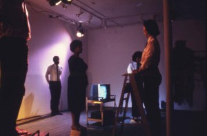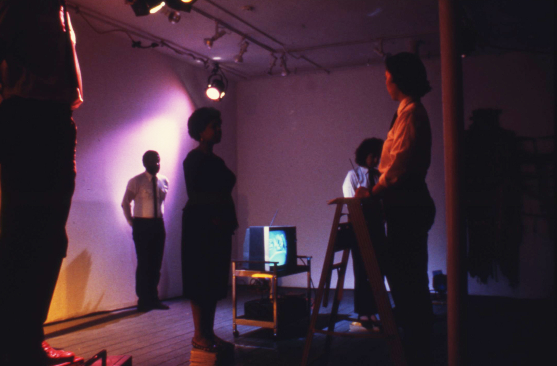 Medium: VHS video Comments: Hassinger writes that “’Voices’ was first performed at The Women’s bldg. in Los Angeles in 1984. It was the separate voices of 6 people made into an orchestra by a conductor. I wrote and directed the action. The conversation was about our relation to nature in the political realm in which we found ourselves.” In a statement read aloud at the end of the 1985 performance, Hassinger states that Voices articulates “concern for the role of nature in an increasingly technological society.” The performance includes video edited by Ulysses Jenkins and quotations from the novels of Walker Percy. It is one of several performances Hassinger describes in her “Manifesto” as “Post-modern commentaries on politics, the end of nature, etc.,” created for friends, including Senga Nengudi and Ulysses Jenkins (“classmates from Lester Horton dance classes”) and Dee McMillin (“a student from Cal Arts”).  In 1985, other cast members included Mary Abrams, Cindy Kahn, and Chris Troy. For the premiere performance at the Women’s Building, May Sun conducted the performers; in 1985, Hassinger served as conductor.