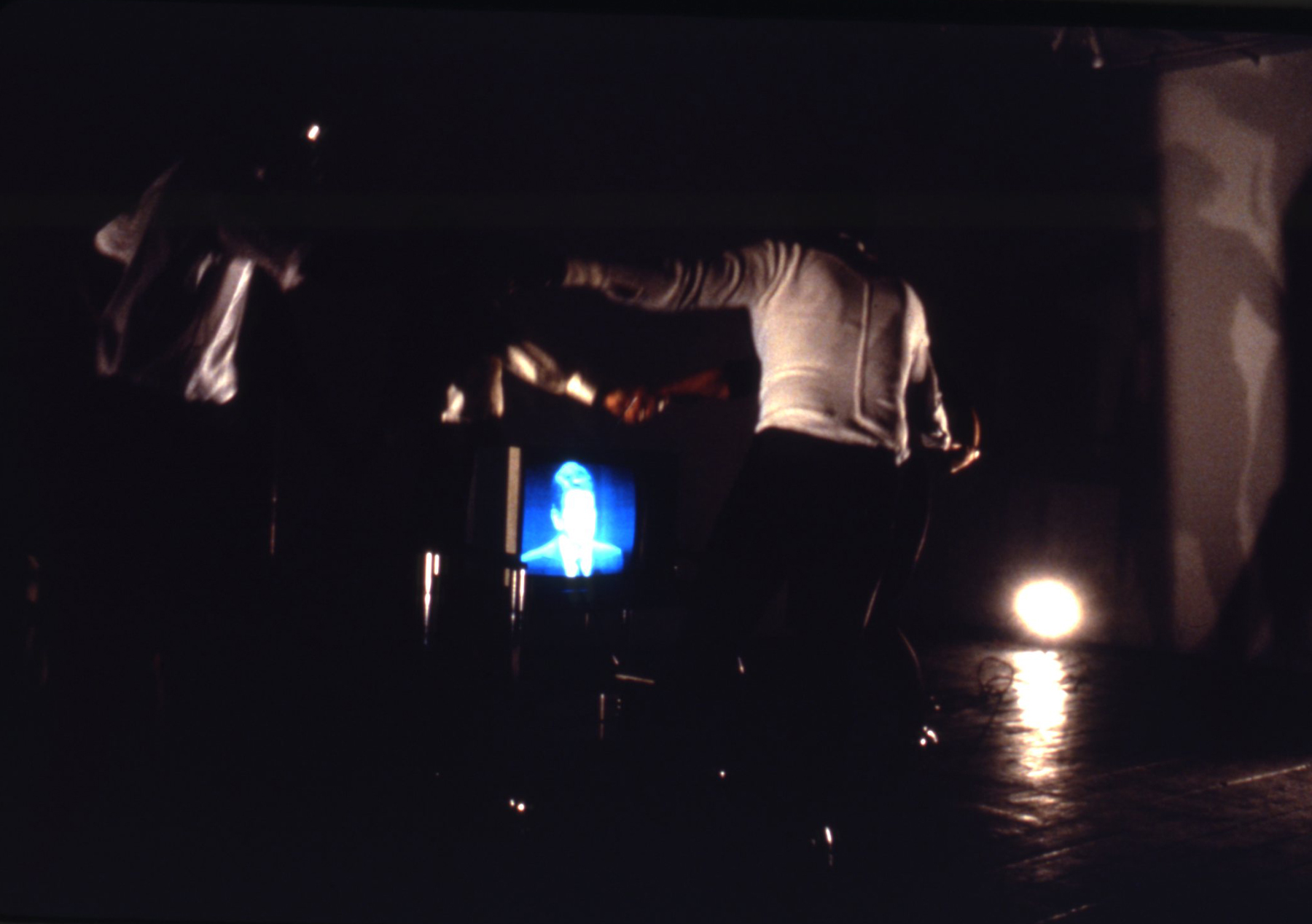 Medium: 35mm slide Comments: Hassinger writes that “’Voices’ was first performed at The Women’s bldg. in Los Angeles in 1984. It was the separate voices of 6 people made into an orchestra by a conductor. I wrote and directed the action. The conversation was about our relation to nature in the political realm in which we found ourselves.” In a statement read aloud at the end of the 1985 performance, Hassinger states that Voices articulates “concern for the role of nature in an increasingly technological society.” The performance includes video edited by Ulysses Jenkins and quotations from the novels of Walker Percy. It is one of several performances Hassinger describes in her “Manifesto” as “Post-modern commentaries on politics, the end of nature, etc.,” created for friends, including Senga Nengudi and Ulysses Jenkins (“classmates from Lester Horton dance classes”) and Dee McMillin (“a student from Cal Arts”).  In 1985, other cast members included Mary Abrams, Cindy Kahn, and Chris Troy. For the premiere performance at the Women’s Building, May Sun conducted the performers; in 1985, Hassinger served as conductor.