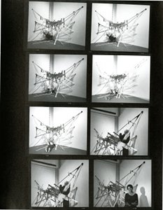 | Medium: photograph | Comments: Installation of venetian blind slats and nylons. 7 x 5 x 4′, |